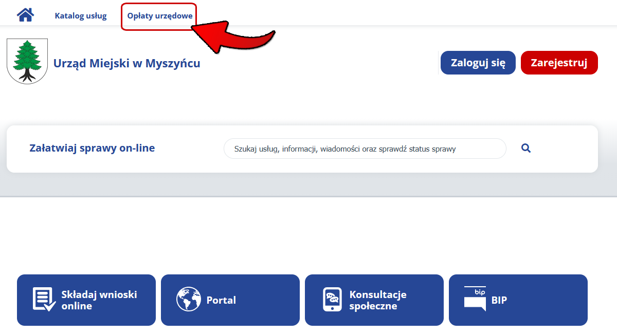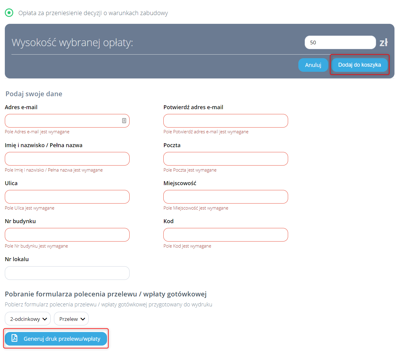 Użytkownik niezalogowany przed przejściem do wyboru płatności (za pomocą przycisku „Dodaj do koszyka”) musi wcześniej uzupełnić wymagane dane osobowe. Po uzupełnieniu danych można również skorzystać z opcji wygenerowania druku do wpłaty aby uiścić należność standardowymi sposobami, tj. przelewem bądź wpłacając pieniądze osobiście na poczcie.
