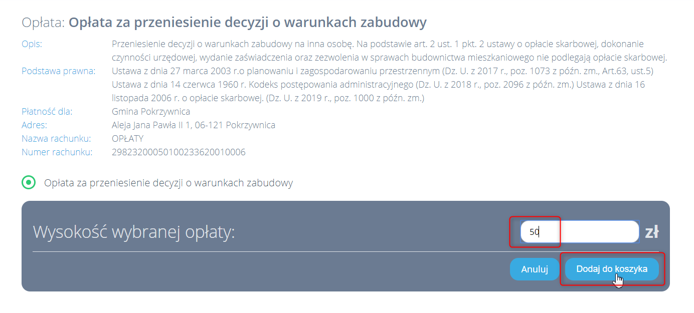 - Użytkownik zalogowany wpisuje kwotę należności jaką musi uiścić i klika „Dodaj do koszyka”: