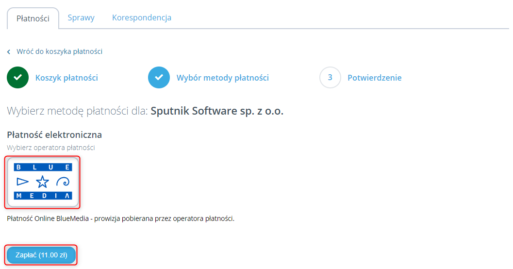 Zostajemy przeniesieni do menu „Płatności” gdzie klikamy przycisk „Przejdź do wyboru płatności: