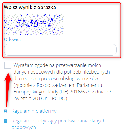 • Następnie należy uzupełnić captcha (podać wynik działania) oraz wyrazić zgodę na przetwarzanie danych osobowych.