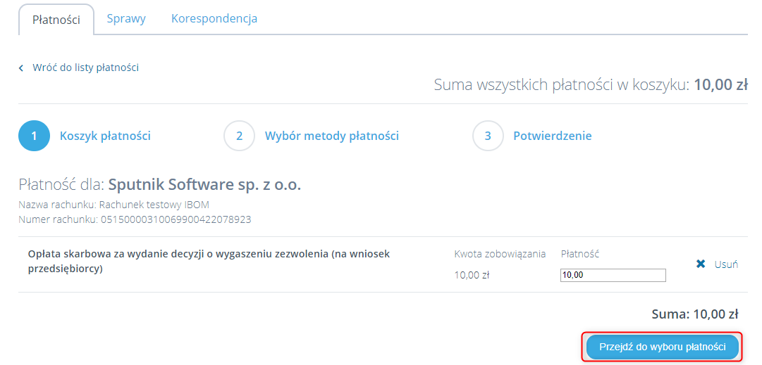 Zostajemy przeniesieni do menu „Płatności” gdzie klikamy przycisk „Przejdź do wyboru płatności: