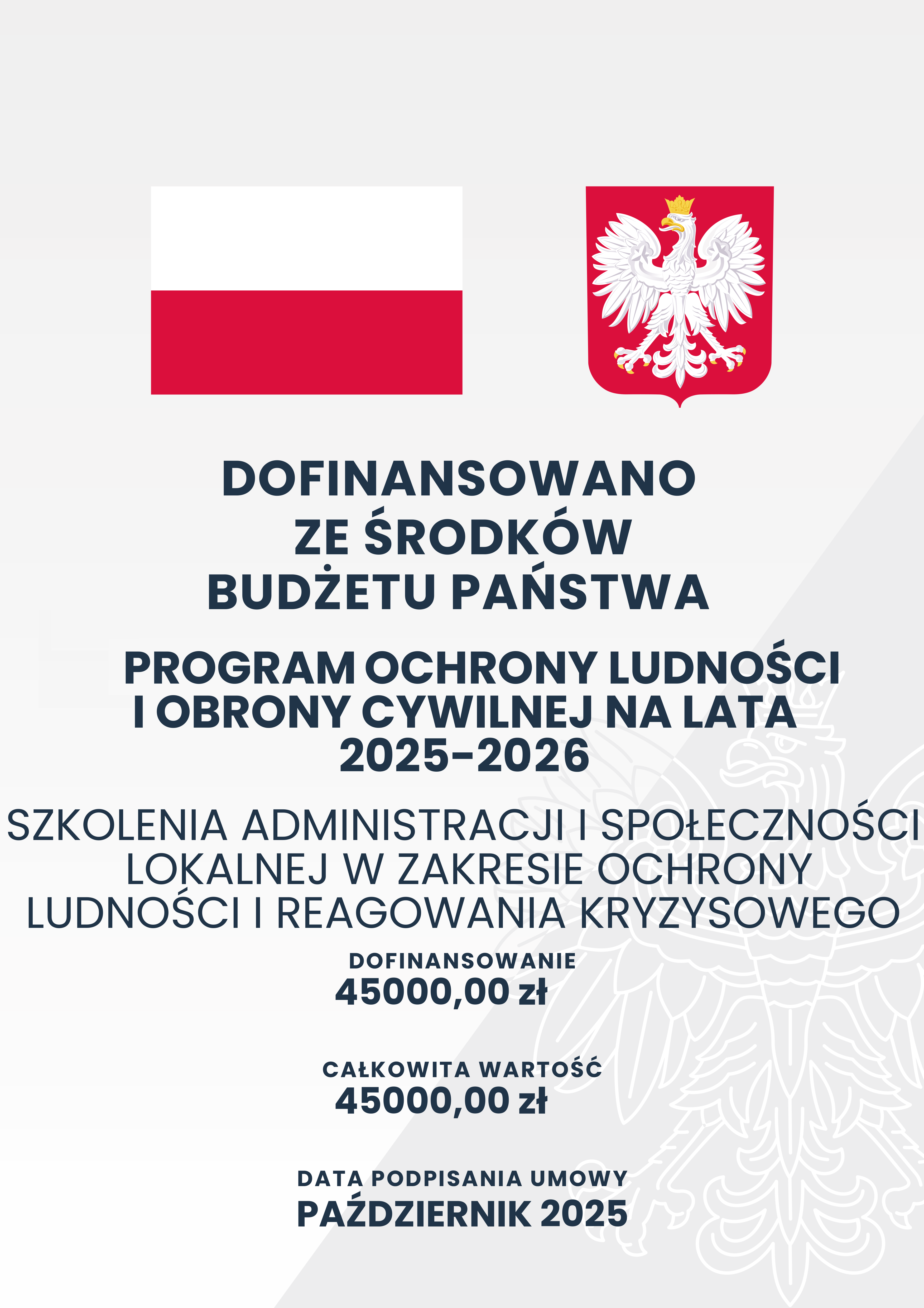 Szkolenie finansowane w ramach Programu Ochrony Ludności i Obrony Cywilnej w roku 2025 na podstawie umowy WBZK-V.3146.2.309.2025 w sprawie przekazania dotacji celowej w 2025r. na realizację zadań ochrony ludności i obrony cywilnej – zadania własne.